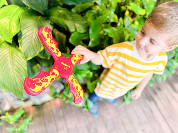 Zaradi odpornega materiala in opaznega dizajna je bumerang odličen za družinske izlete, vrt in park. Spodbuja gibanje, natančnost in koordinacijo oko–roka, hkrati pa ostaja zabavna igrača za vso družino.