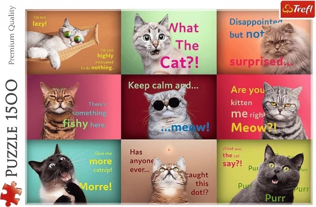 Te puzzle Zabavni portreti mačk imajo 1500 kosov in sestavljajo sliko dimenzij 85 x 58 cm. Izdelano iz visokokakovostnih materialov in posebnega kalandriranega papirja, ki odbija svetlobo, so idealne za enostavno sestavljanje. Ustvarjeno na Poljskem z ekološkim zavedanjem.
