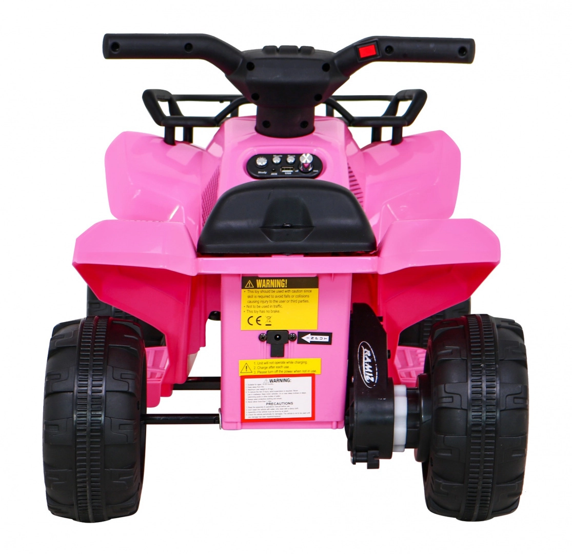 Stajliš otroški štirikolesnik Quad Storm ponuja varno zabavo doma in na prostem. Ima električni pogon 25 W, baterijo 6 V/4,5 Ah, sprednje LED luči in avdio ploščo z MP3/USB in AUX. Enostavno upravljanje z gumbom za plin na krmilu ter stabilna plastična kolesa za gladko vožnjo.