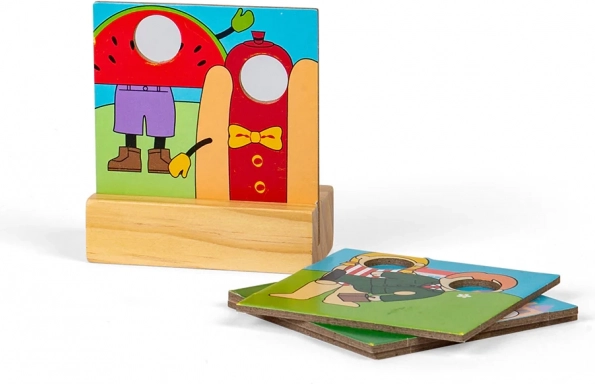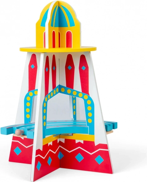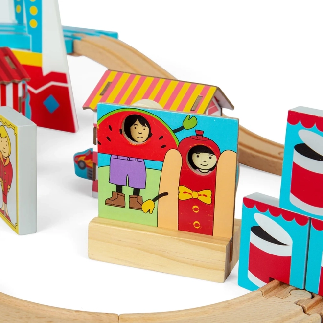 Ta lesena vlakovna proga z motivom zabavnega sejma vsebuje vse potrebno, da se potopite v svetove, polne zabave in veselja. Otroci se lahko z vlakom peljejo mimo cirkuškega šotora, lovijo račke ali se fotografirajo z zabavnimi foto rekviziti. Set vključuje: