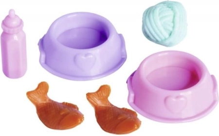 V paketu boste našli različne igrače in dodatke, ki posnemajo resnične potrebe za živali, kot so srčkane sklede ali žogica.