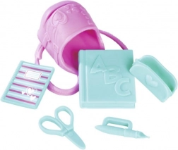 Vključuje šolske potrebščine kot so zvezek, škarje, peresnica, pero in učbenik za realistično igro.