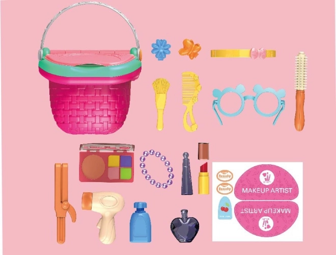 Odkrijte čar ličenja in nege las s tem prikupnim igralnim setom v praktični košarici. V njej najdete kar 18 dodatkov, kot so parfum, šminka, senčila za oči, sušilec za lase in dodatki za lase – idealno za ustvarjalno igro in razvoj domišljije.