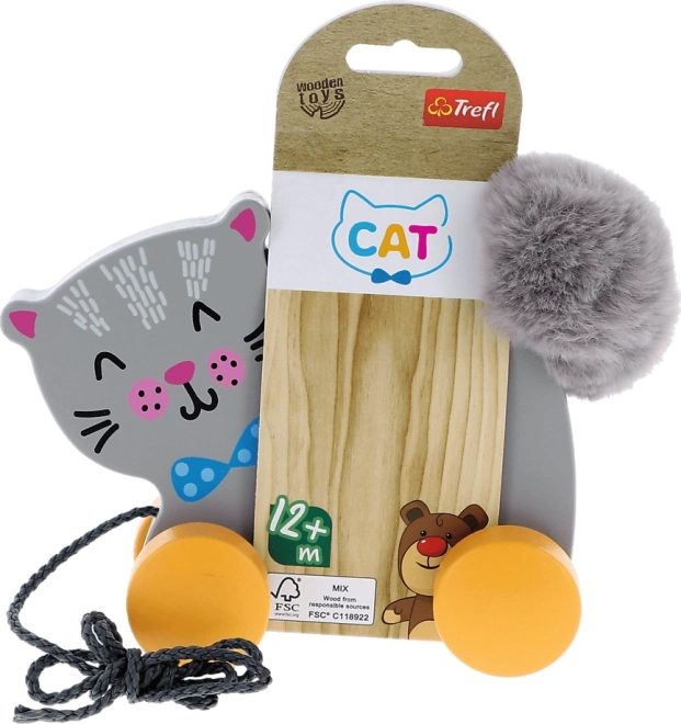 Prisrčna lesena mačka na vrvici bo razveselila vsakega malčka. Izdelana je iz naravnega lesa, ima gladke oblike za majhne ročice in se zahvaljujoč kolescem zvesto »teče« za otrokom. Spodbuja prve korake, razvija fino motoriko in prijem ter stimulira čute z mehkim repkom. Površina je obdelana z netoksičnimi, varnimi barvami.
