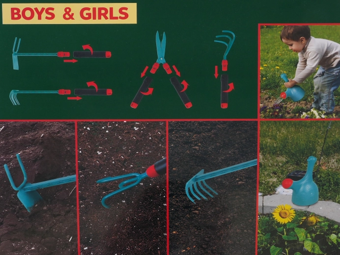 Komplet varnih vrtnarskih orodij za otroke od 3 let dalje. Komplet vsebuje vse, kar je potrebno za delo na vrtu. Orodje je varno, brez ostrih robov in idealne velikosti za majhne roke. Ročaji orodij so dodatno snemljivi. Komplet je v univerzalni barvni izvedbi, ki je primerna tako za fante kot dekleta.