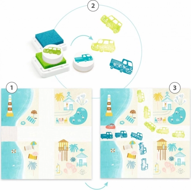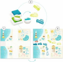 Komplet štampiljk z motivom avtomobilčkov, ki otrokom omogoča ustvarjanje prisrčnih slik in razvoj njihove kreativnosti.