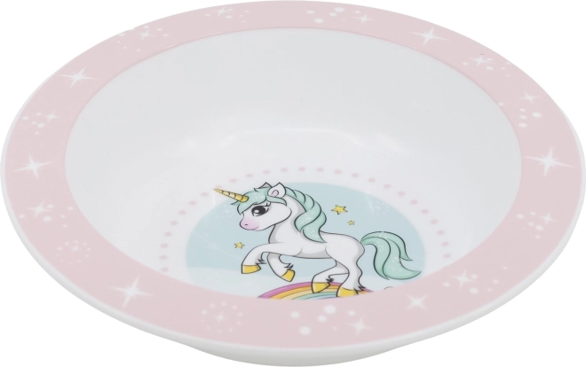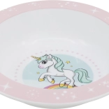 Otroška jedilna skleda s čarobnim motivom samoroga spodbuja veselje do hrane in samostojnost za mizo. Ergonomska oblika dobro sede tudi v manjše ročice, trpežna izvedba pa je idealna za vsakodnevno uporabo.