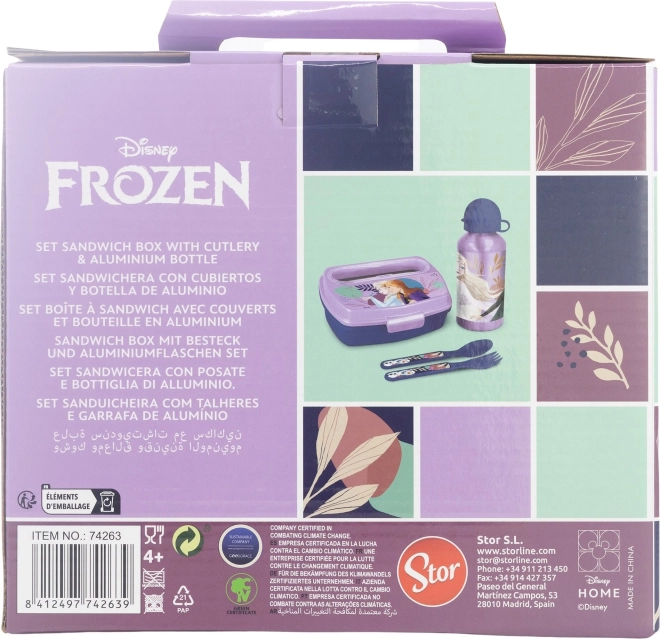 Štiridelni jedilni set za otroke z motivom FROZEN znamke STOR: vsebuje aluminijasto stekleničko 400 ml, škatlo za malico in set pribora (žličko in vilico). Idealno za v šolo in na izlete, brez BPA.