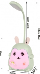 Ta ljubka nočna in namizna lučka združuje igriv dizajn s praktičnimi funkcijami. Prilagodljivo roko omogoča preprosto usmerjanje svetlobe na knjigo ali zvezek, medtem ko telo lučke ustvarja prijetno vzdušje za mirno uspavanje.