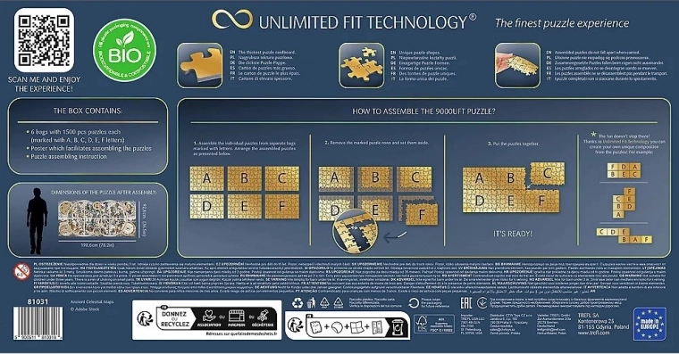 Set vsebuje 6 ugank (vsaka s 1500 koščki), ki jih lahko povežete skupaj in ustvarite velikanski motiv po priloženem plakatu, ali pa sprostite svojo domišljijo in ustvarite lastno kompozicijo. Sestavljanke so odličen trening spomina, razvijajo ročne spretnosti ter krepijo koncentracijo, potrpežljivost in bistrost. So izjemno darilo za ljubitelje ugank, odrasle in otroke, starejše od 12 let. Skupna velikost sestavljenega motiva po predlaganem postopku znaša 198,6 x 92,8 cm.*