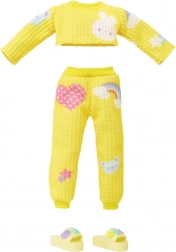 Dvodelna rumena pižama z igrivimi motivi, ujemajoči se copatki in izrazite mašnice v laseh poudarijo edinstven stil lutke.