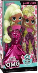 Punčka L.O.L. Surprise! O.M.G. Lady Diva prinaša razkošen slog, bleščeče detajle in izrazit rožnat videz, ki navduši na prvi pogled. Zahvaljujoč premičnim sklepom je odlična za poziranje in fotografiranje, bogata oprema dodatkov pa spodbuja kreativno kombiniranje oblačil.