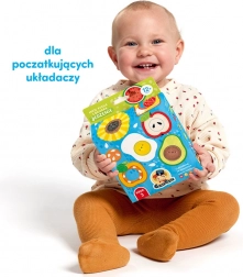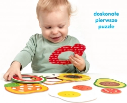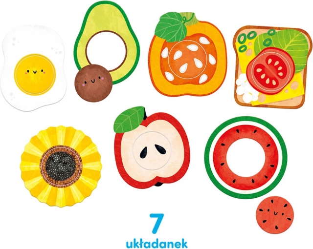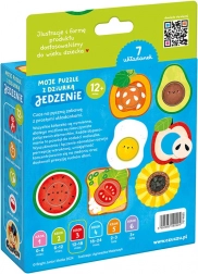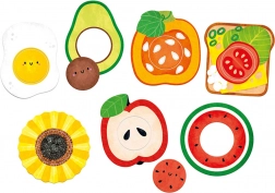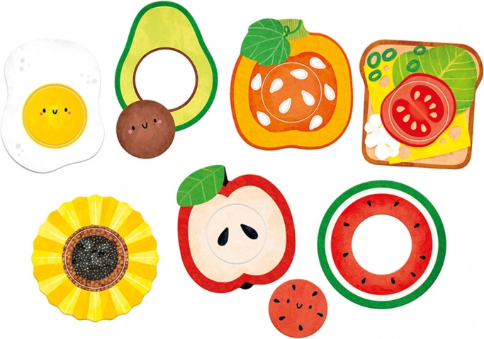 Igra s sestavljanko naravno razvija fino motoriko, pozornost in potrpežljivost. Skupaj lahko poimenujete živila, barve in oblike, iščete podobnosti in razlike ter si izmišljate vprašanja, kot so »Kaj ima koščice?« ali »Kje je jajce?«. Starejši otroci bodo koščke uporabili tudi pri igri trgovine ali kuhanja ali kot navdih za lastne risbe.