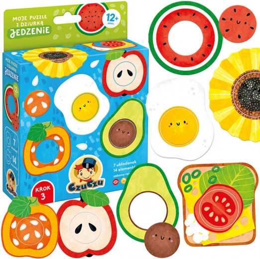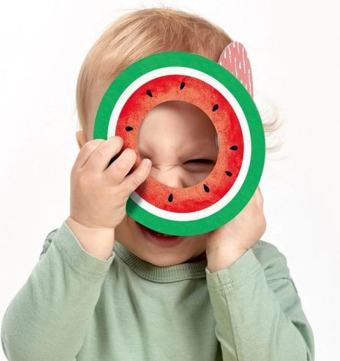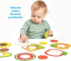 Moje sestavljanke z luknjico – hrana so idealna prva sestavljanka za malčke. Veliki, trdni koščki z veselimi ilustracijami priljubljenih dobrot vabijo k igri in učenju. Zamenljiva kolesca je mogoče vstavljati tudi »obrnjeno« ali med posamezne slike, zato nastajajo zabavne in nepričakovane kombinacije, ki jih otroci obožujejo.