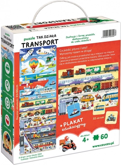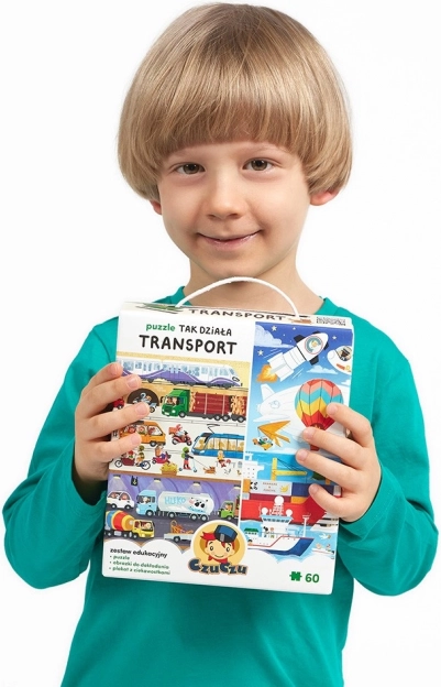 Sestavljanka Tako deluje promet je edinstven izobraževalni komplet za predšolske otroke, zlasti za tiste, ki imajo radi različna vozila. Sestavljen je iz 60-delne sestavljanke, 32 ujemajočih se sličic in izobraževalnega plakata. Gremo se zabavat! Posveti pozornost temu, kaj vozi po cestah, pluje po vodi in leti v zraku. Znana in priljubljena ter tudi manj očitna prevozna sredstva so odlična motivacija za igro. Zlaganje sestavljanke otrokom na zabaven način razvija opazovanje, potrpežljivost in prinaša nova znanja. Zabavaj se!