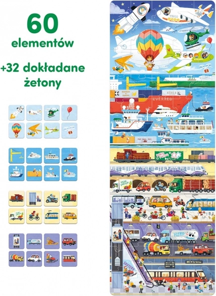Velika barvita sestavljanka ima 60 koščkov in prikazuje najrazličnejša prevozna sredstva, ki prevažajo potnike in blago. Ali jih prepoznaš vse? Na plakatu, priloženem sestavljanki, boš našel veliko zanimivosti o prometu, 32 sličic z elementi za iskanje na ilustraciji pa omogoča še več ustvarjalne zabave. Set je idealna izobraževalna ideja za darilo za radovednega predšolskega otroka, še posebej za ljubitelje motorjev in vozil.