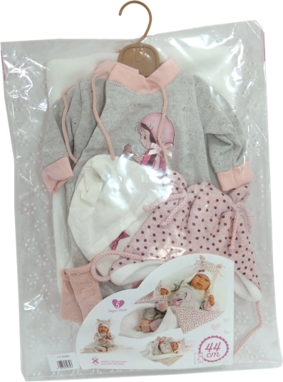 Privoščite svoji punčki nov šik outfit, ki spodbuja domišljijo in veselje do igre. Ta 4-delni komplet za punčke NEW BORN (43–44 cm) združuje udobje in stil – usklajene hlače in top dopolnjuje mehka odejica s cofom za zavezovanje ter drugi prikupni dodatki. Ročna izdelava v Španiji zagotavlja natančne detajle in prijetne materiale, primerne za otroško igro.