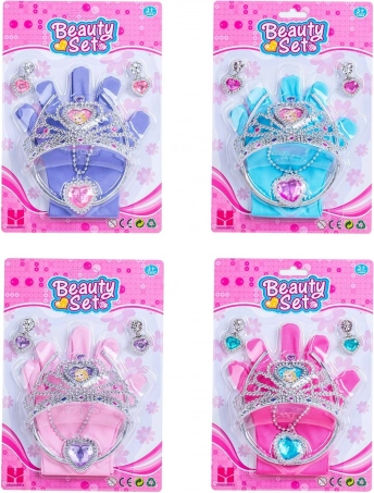Čaroben komplet dodatkov za male princeske vsebuje vse, kar je potrebno za popoln videz: rokavičke, krono (12,5 cm), naglavni trak, ogrlico in uhane. Na voljo so 4 barvne različice – modra, vijolična, rožnata in rdeča.