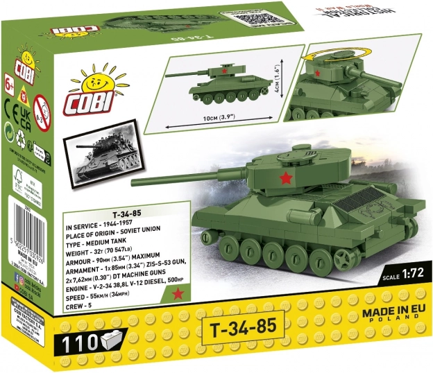 Model T-34-85 je eden najbolj znanih tankov druge svetovne vojne, v tej COBI stavebnici pa ga boste sestavili kot zvesto repliko. Kakovostna plastika, natančni ulitki in premišljena konstrukcija zagotavljajo enostavno sestavljanje in trpežnost pri igri. Stavebnica je idealna za otroke od 6 let dalje, razveselila pa bo tudi zbiratelje in ljubitelje vojaške zgodovine.