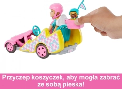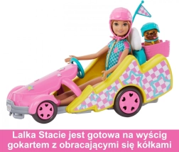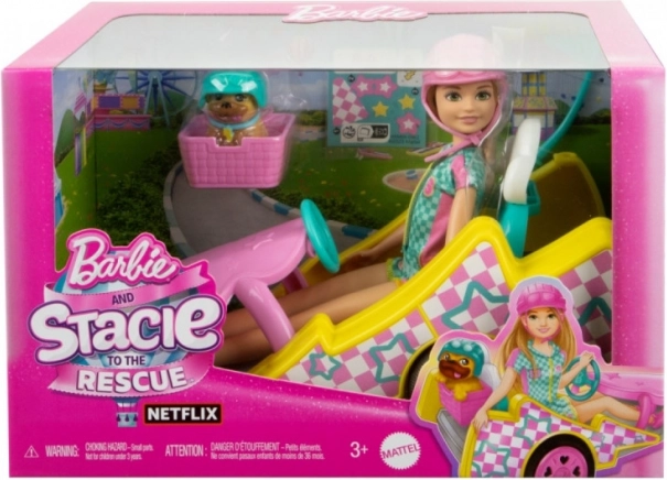 Zapeljite s polno hitrostjo z lutko Stacie in njenim gokartom. Zahvaljujoč vrtečim se kolesom, šahovničastemu vzorcu, snemljivi zastavici in košarici za kužka je to vozilo videti prav takšno kot v filmu "Barbie: Stacie na pomoč".
