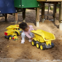 Šest velikih koles zagotavlja izvrstno stabilnost na terenu in na tleh. Pnevmatike, ki ne puščajo sledi, so prijazne do talnih oblog, ročaj pa omogoča tekoče in varno preklapljanje tovora. Igra s prekucnikom razvija grobo motoriko, koordinacijo ter spodbuja samostojnost in raziskovanje.
