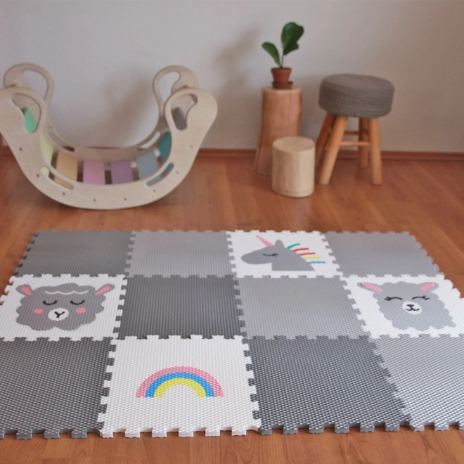 - 12 penastih puzzle podlog (4 sive, 4 svetlosive, 1 bela z lamo, 1 bela z jagnjetom, 1 bela z mavrico, 1 bela s svetlosivim samorogom)
