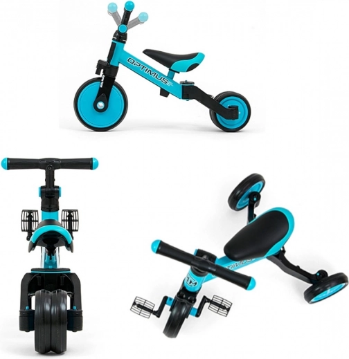 Poganjalec 3v1 OPTIMUS raste z vašim otrokom – od prvih korakov v načinu stabilnega tricikla, preko treninga poganjanja s pedali, do hitrega in lahkega klasičnega poganjalca. Zahvaljujoč kakovostnim materialom in premišljeni zasnovi podpira razvoj motorike, moč nog in koordinacijo.
