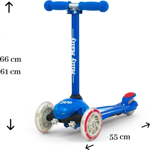 Otroški skiro Zapp Milly Mally je zasnovan z mislijo na potrebe otrok. Zaradi aluminijastega odstranljivega krmila je izjemno lahek. Nedrseči ročaji z zaščitnimi pokrovi ščitijo roke malega popotnika, podest, prekrit s posebnim nedrsečim premazom, pa zagotavlja boljši oprijem. Zahvaljujoč tem funkcijam se bo otrok pravilno in hitro razvijal, obenem pa užival v obilici zabave.