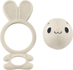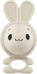 Silikonski zajček z teksturiranimi ušeski in odprtino za varen prijem dojenčka. Odstranljiva zveneča kroglica motivira k gibanju in razvija fino motoriko.