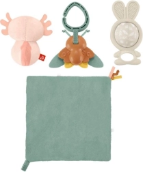 - 4 igrače: silikonsko grizalo v obliki zajčka (brez BPA) z odstranljivo zvenečo kroglico, plišasti aksolotl z zvončkom, tipna ropotuljica‑metulj s sponko, mehak šumeč panel s trakom