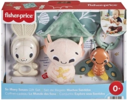 Darilni komplet FISHER‑PRICE Svet čutov je premišljen izbor prvih igrač za dojenčke, ki vabijo k raziskovanju z kontrasti, različnimi teksturami in nežnimi zvoki. Vsak kos je zasnovan za varen prijem, pomiritev ob izraščanju zobkov in podporo zgodnjemu senzoričnemu razvoju.