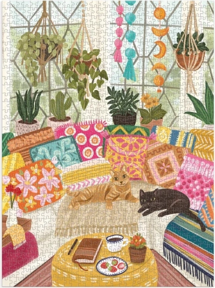 Elegantna sestavljanka z motivom dveh mačk v raju ročno izdelanih tekstilij in sobnih rastlin je odlična izbira za mirne trenutke ali kot izvirno darilo. Zahvaljujoč vrhunskemu tisku z neškodljivimi barvami in mat zaključku izstopajo detajli in barvna vernost.