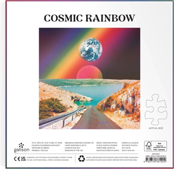 Uživajte v urah zabave z izvirnim puzzlom GALISON Cosmic Rainbow. Ta 500-delna sestavljanka povezuje obalno pokrajino s kozmično sceno in živahnimi barvami, ki ustvarjajo resnično očarljivo vizualno doživetje. Zaradi natančno izrezanih koščkov, vzdržljive izdelave in uporabe recikliranih, nestrupenih materialov je odlična izbira za ljubitelje puzzlov, dizajna in trajnosti.