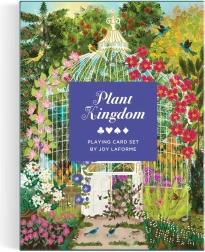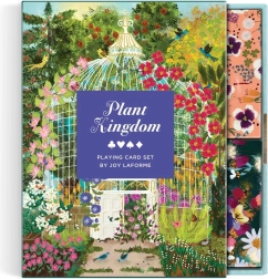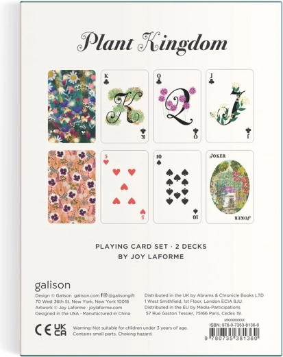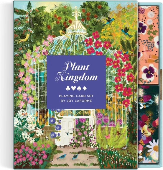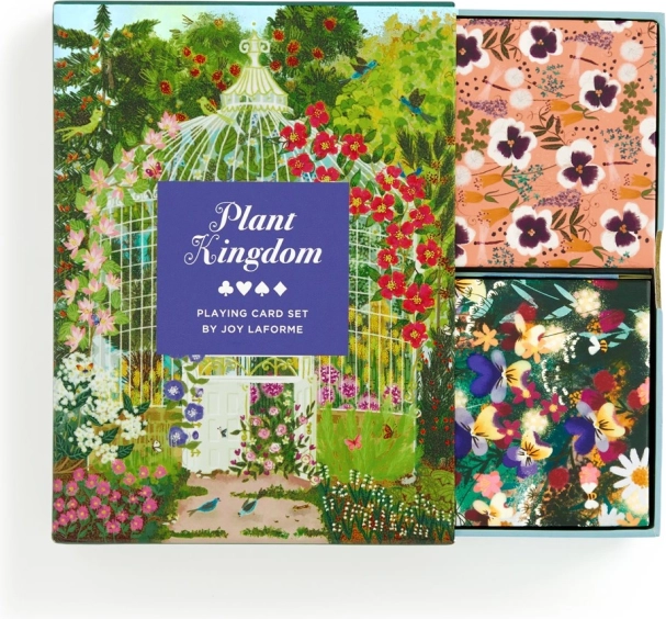 Komplet igralnih kart Rastlinsko kraljestvo od Galison združuje lepoto narave in umetniški dotik Joy Laforme. Dva kompleta kart vsebujeta edinstvene motive cvetlic in vrtov, ki vas povlečejo v svet poln barv in harmonije. Karte ne bodo samo očarale s svojo lepoto, temveč tudi prinašajo veselje pri vsaki igri.