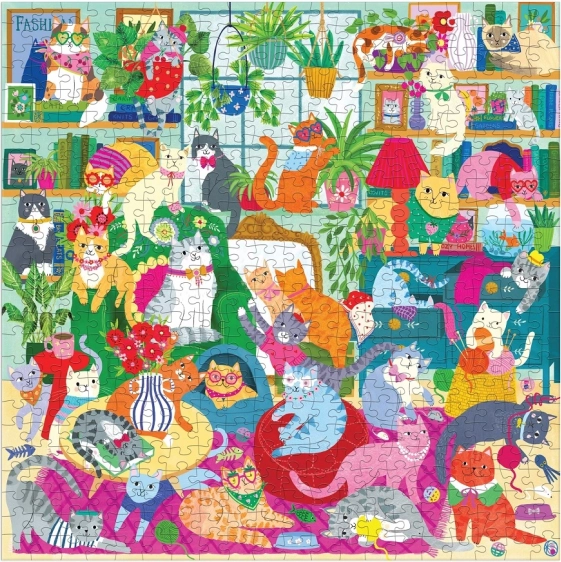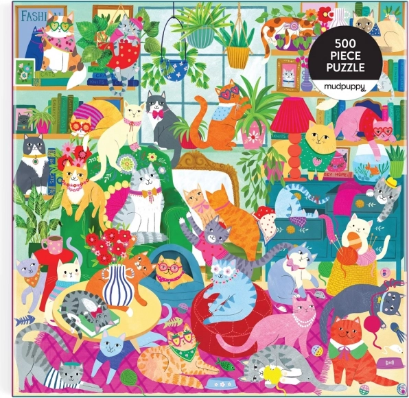 Sestavljanka ponuja barvito ilustracijo polno mačk v različnih barvah in vzorcih v prijetnem domačem okolju.