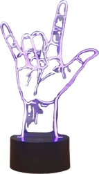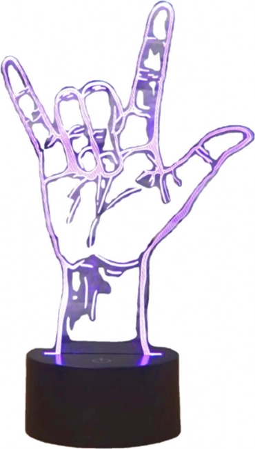 LED nočna svetilka v obliki roke z znamenjem V na akrilni plošči je namenjena za postavitev na ravno površino s posebno osnovo, ki služi tudi kot napajalna postaja. Ponuja svetlo LED osvetlitev z možnostjo spreminjanja barv. Napajati jo je mogoče s 3 AA baterijami ali preko običajnega USB priključka, kar omogoča fleksibilnost pri izbiri namestitve brez potrebe po priključitvi na električno omrežje.