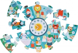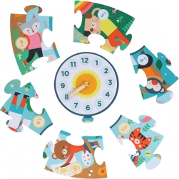 Na sredini sestavljanke je velik številčnik z nastavljivimi kazalci. Otroci na zabaven način vadijo določanje ur in minut ter povezujejo igro s praktičnim učenjem.
