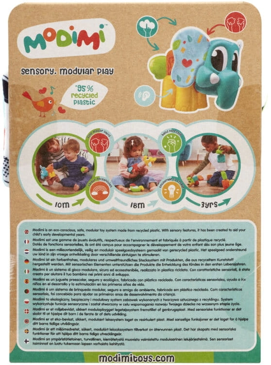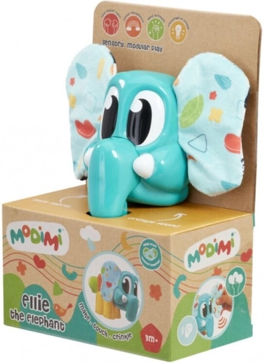 Prisrčen slonček Ellie blagovne znamke Modimi je okolju prijazna, varna in modularna senzorična igračka iz reciklirane plastike, ki podpira zgodnji razvoj otroka. Ponuja šušteča mehka ušeska, teksturiran trebušček–kocko, komplet nožic in repek. Deli iz različnih kompletov Modimi se zlahka kombinirajo za še več kreativne zabave.