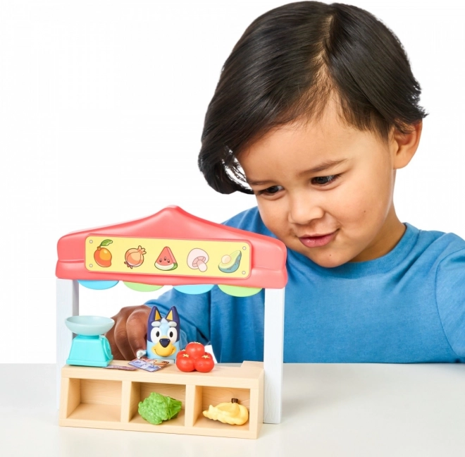 Del seta je figurica BLUEY in pisan nabor sadja ter zelenjave za neskončne igralne scenarije.