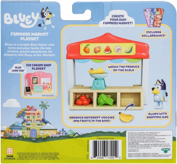 Vnesite vzdušje kmečkih tržnic v svoj dom in dovolite otrokom vstop v svet BLUEY. Ta barvit set s tržnično stojnico, tehtnico, predalčki za sadje in zelenjavo ter figurico omogoča, da se vsak dan spremeni v poln zgodb in učenja skozi igro.