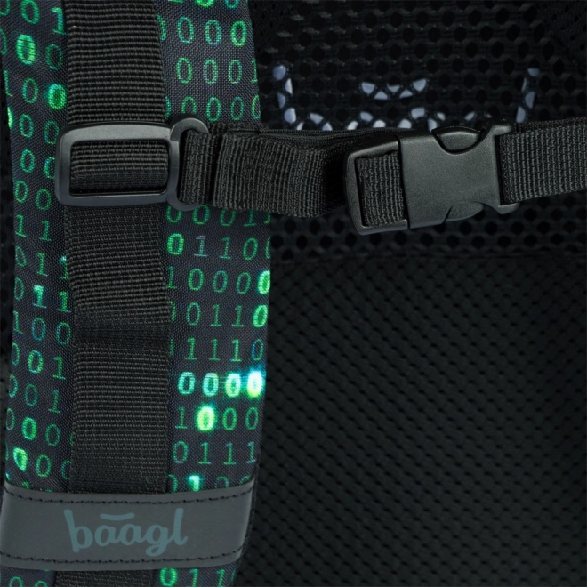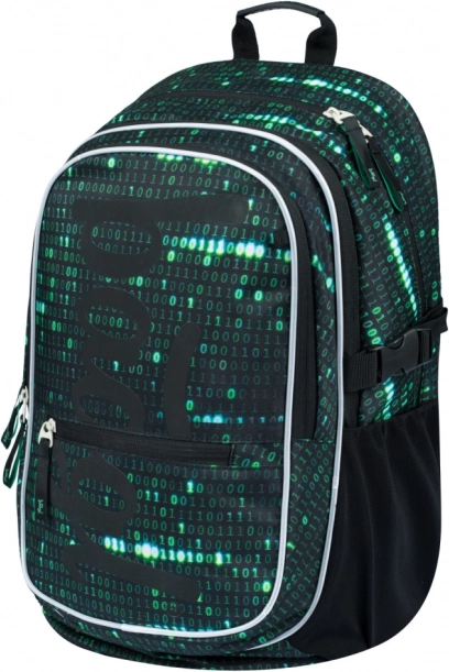 Ta nahrbtnik izstopa z edinstvenim dizajnom z motivom binarne kode v zeleni in črni barvi, ki pritegne pozornost vsakega tehnološko usmerjenega učenca ali študenta.