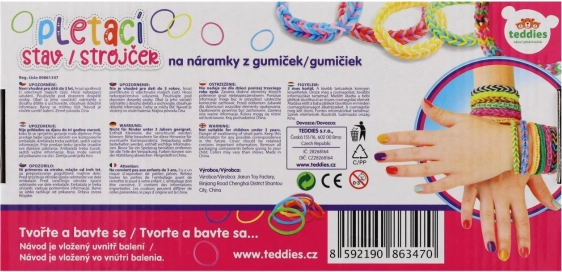 - 600 kosov silikonskih gumic (mešanica barv), trivrstne statve, kvačka, zapirala, navodila