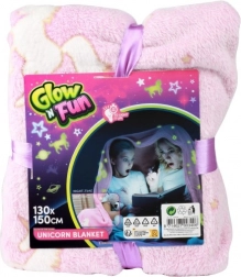 Odkrijte čar večernega udobja s to mehko rožnato odejo, ki po osvetlitvi zasije z motivi samorogov in zvezdic. Za najboljši učinek zadostuje močnejša svetloba – čim dlje jo pustite “osvetliti”, tem dlje in svetleje bo žarela v temi.