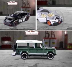 Izberite iz mešanice licenciranih vozil: AUDI RS e-tron GT, BUGATTI Chiron Pur Sport, LAND ROVER Defender 110, NISSAN GT-R in PORSCHE Taycan Turbo S. Pošiljamo naključno izbran model.