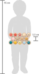 Set vsebuje 28 lesenih diskov z barvnimi in na dotik izrazitimi polnili ter tekstilni žakelj za shranjevanje. Zaradi kompaktnih mer je igra odlična tudi za na pot – doma, v vrtcu ali otroškem kotičku.