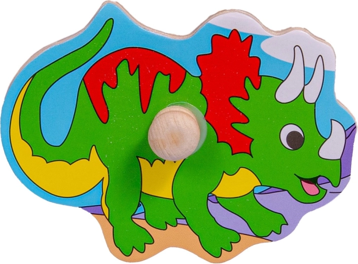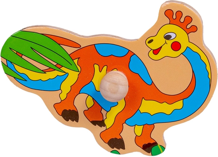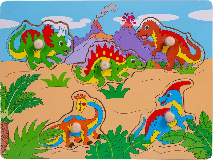Lesena sestavljanka z motivom dinozavrov za razvoj otroške fine motorike in kognitivnih veščin. Vsebuje pisane lesene koščke z ročaji za enostavno uporabo.
