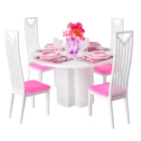 Stilski jedilni set za hiško za punčke vključuje okroglo mizo s 4 stoli, celoten jedilni servis in pribor, 8 kozarcev ter vazo s cvetjem. Spodbuja kreativno igro, razvoj socialnih veščin in je zaradi hitre montaže idealen tudi za na pot. Primerno za punčke do 29 cm.