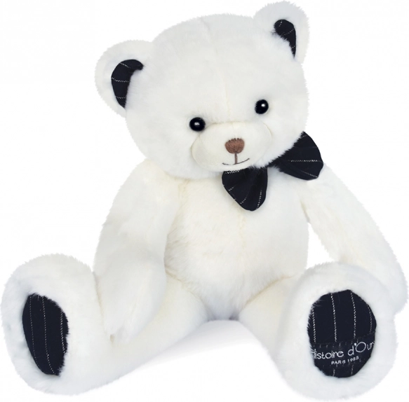 Prisrčen in mehak plišasti medvedek v barvi slonovine s temno modrim črtastim metuljčkom je idealen prvi prijatelj v posteljici in čudovita dekoracija otroške sobice. Izdelan je iz vrhunskega, žametno mehkega pliša, izpolnjuje evropske standarde CE in je primeren od rojstva dalje. Priložena je lepa darilna škatla, zaradi katere je odlično darilo za božič ali ob rojstvu dojenčka.