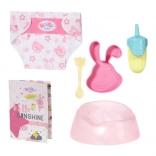 • Bogati dodatki: steklenička, dudica na traku, plenica, krožniček, žlička, nočna posoda in drugi pripomočki za igro nege.