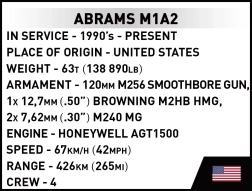 Z gradbenim kompletom COBI Abrams M1A2 ustvarite realističen mini model modernega glavnega bojnega tanka. V merilu 1:72 meri dokončan model približno 14 cm in ohranja značilne linije ter avtentična označevanja izvirnika.